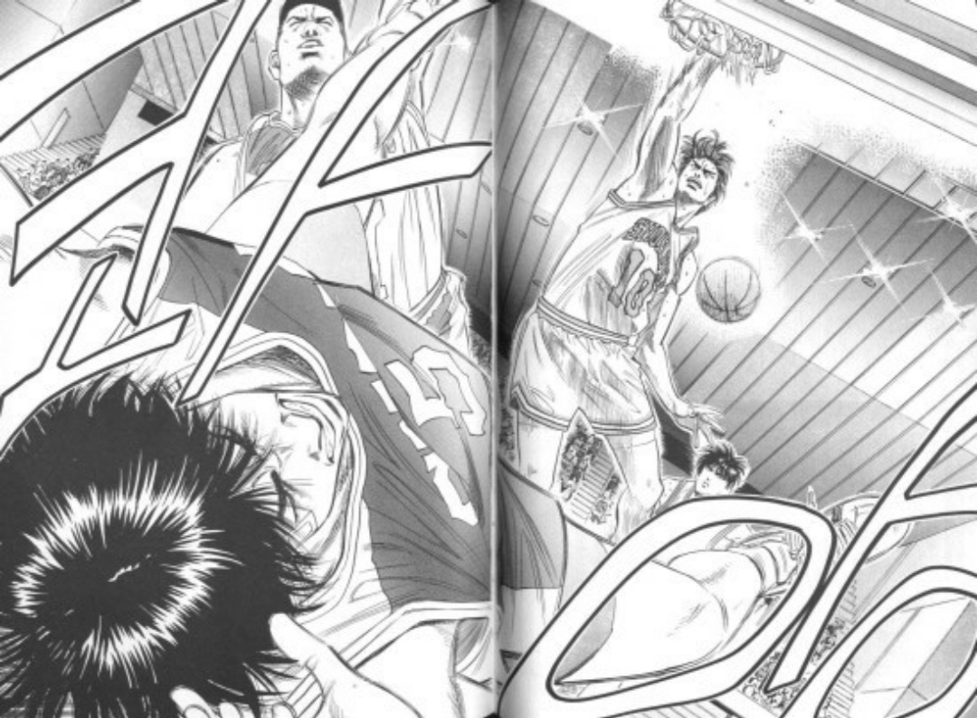 "아빠, 슬램덩크에서 강백호가 시합에서 처음으로 덩크 성공했어요!"