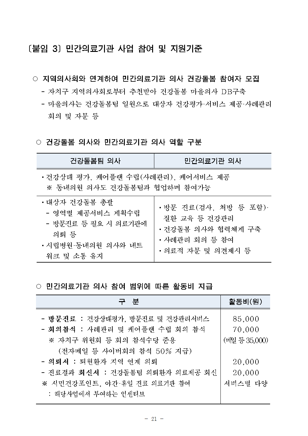 민간의료기관 의사는 방문진료(검사 및 처방 포함)·질환 교육 및 건강관리, 건강돌봄의사와 협력체계 구축, 사례관리 등 회의 참여, 의료적 자문 및 의견제시, 의뢰서/진료결과 회신서 작성 등의 업무를 맡게되고, 적지만 수가도 있기는 하다.