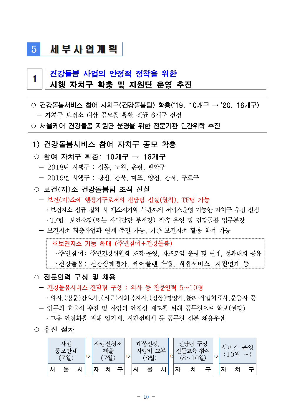서울시는 2018년 부터 건강돌봄서비스를 신청한 자치구에 한해서 진행하고 있다. 이는 보건복지부의 지역통합돌봄(커뮤니티 케어) 선도사업과는 별도로, 서울시에서 integrated care를 실현시키기 위해 착수한 사업이다. 2018년은 성동, 노원, 은평, 관악구 4개구였고, 2019년은 광진, 강북, 마포, 양천, 강서, 구로구까지 총 10개구로 늘었났다. 올해는 16개구로 늘릴 예정이다.