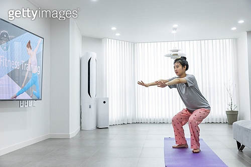 덤벨과 문틀 풀업바, 실내용 자전거, 푸쉬업 손잡이, 폼롤러 마사지와 매트를 이용 중이다.