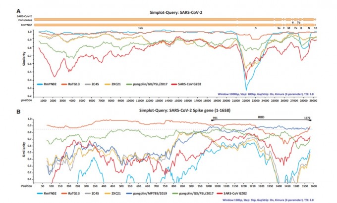 '셀(Cell)' 논문에서 가져온 사스코로나바이러스-2와 기존 코로나바이러스들의 유전자 유사성을 비교한 그래프이다. 전체 염기서열과 스파이크 단백질의 염기서열을 나누어서 표시하고 있다. 여기에는 옌 리멍의 보고서에서 사스코로나바이러스-2를 만들 때 기본 틀로 사용했다고 주장한 ZC45와 ZXC21 두가지 박쥐 코로나바이러스도 나와있는데, 전체 유전자 염기서열과 스파이크 단백질의 주요결합부위 염기서열 모두 사스코로나바이러스-2와의 유사성이 낮은 것으로 확인된다.