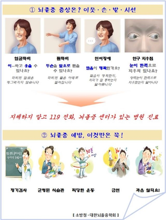 급성 뇌경색은 한시라도 빨리 진단과 치료를 시작해야 그 후유증을 줄일 수 있으므로, 이런 증상이 발생하면 119로 연락하여 뇌졸중 센터가 있는 의료기관으로 이송해야 한다. 급성 뇌경색의 치료에는 증상의 발생 시간에 따라 치료 방법이 달라지므로, 증상을 발견한 보호자는 언제 그 증상이 발생했는지 또는 언제까지 상태가 괜찮았는지 시간을 미리 기억해서 의료진에게 알려주면 큰 도움이 된다. 그리고 뇌경색 환자와 보호자는 혹시라도 뇌경색이 재발할 것에 대비해 내가 살고 있는 지역에 뇌졸중 센터가 있는 의료기관이 어디인지 확인하는 것이 좋다.