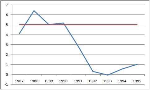 A classic example of an L-shaped recession occurred in Japan following the bursting of the Japanese asset price bubble in 1990. From the end of World War II throughout the 1980s, Japan's economy was growing robustly. In the late 1980s a massive asset-price bubble developed in Japan. After the bubble burst the economy suffered