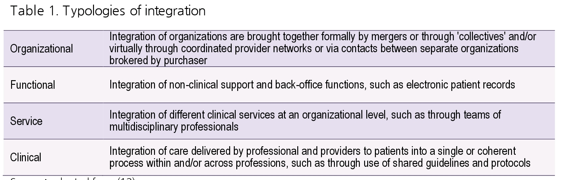 A. Lewis 등은 integration의 <형태(type)>에 따라서, 즉 기관(organizational), 기능(functional), 서비스(service), 임상(clinical) 에 따라 integration을 네가지로 구분