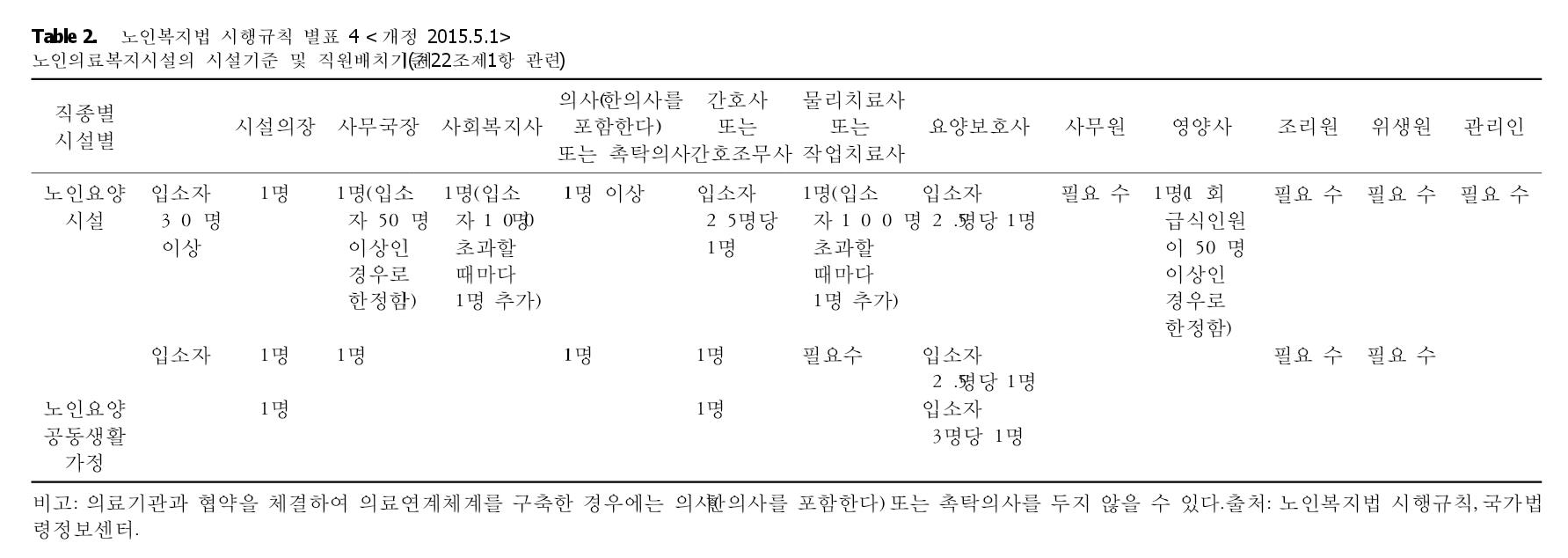 <노인의료복지시설의 시설기준 및 직원배치기준>을 명시한 노인복지법 시행규칙 별표4에는,