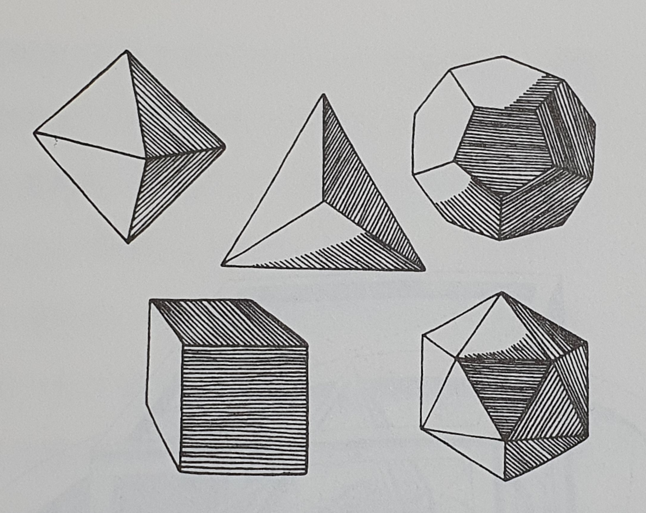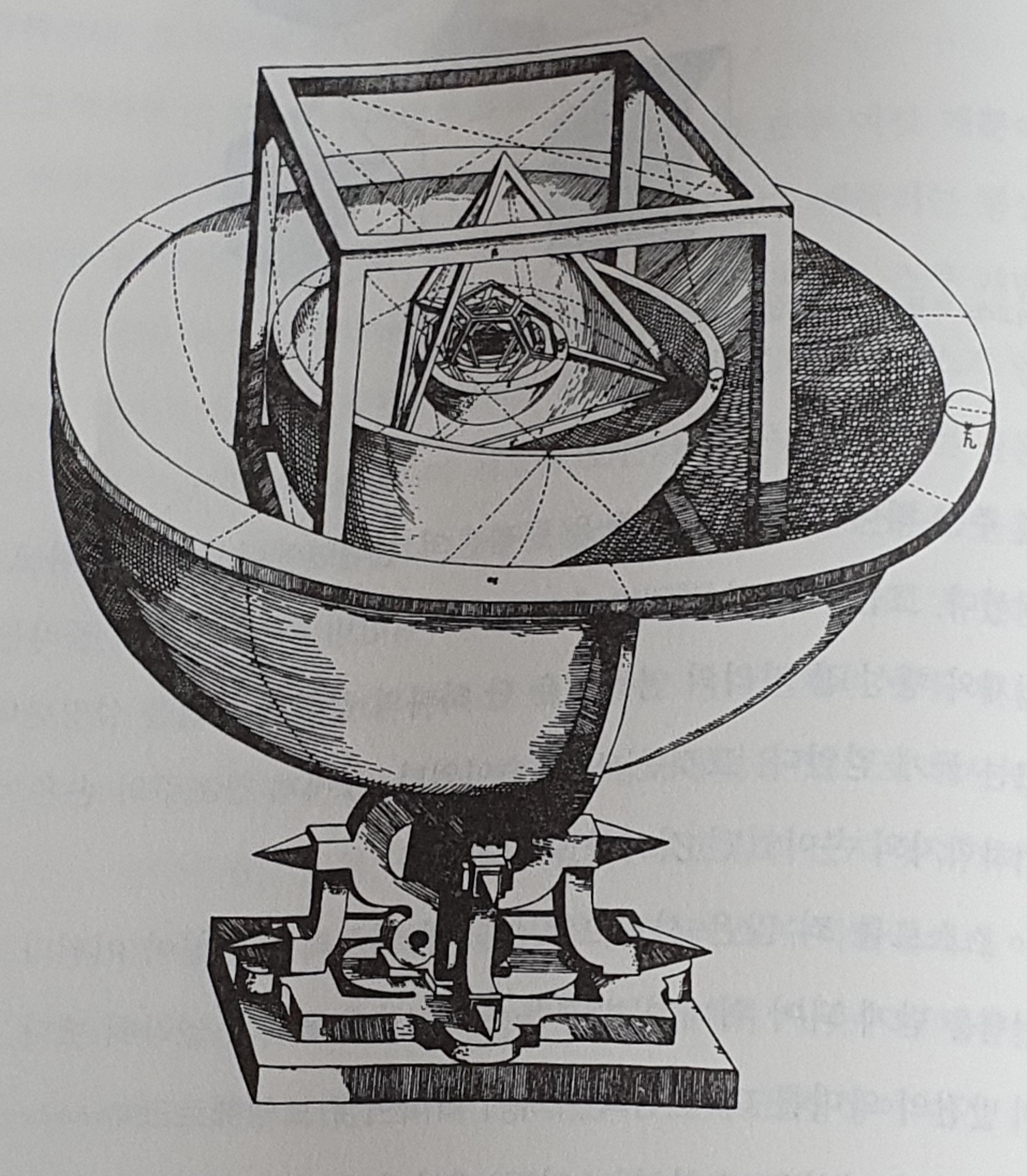 성격에 맞지 않고 지루했던 시골 학교의 수학 강의 시간에 문득, 케플러는 '플라톤의 입체'로 불리는 다섯 가지 정다면체를 떠올리고, 정다면체는 다른 정다면체 안에 꼭 맞게 들어갈 수 있는 특징으로 태양과 행성들 사이의 거리를 결정한다면, 행성의 여섯 개 구(당시에는 수성, 금성, 지구, 화성, 목성과 토성 6개의 행성만 알고 있었다.)들을 유지해주는 하나의 투명 구조물을 찾아낼 수 있다고 확신했다.