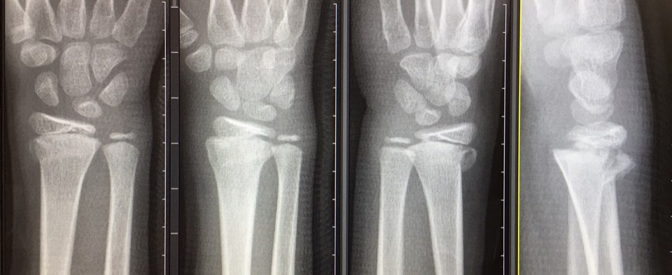 병원으로 와서 엑스레이를 찍었더니, 우측 요골(radius)의 원위부 골절인데, 성장기에 닫히지 않은 성장판(epiphyseal plate)도 침범한 상태였다.