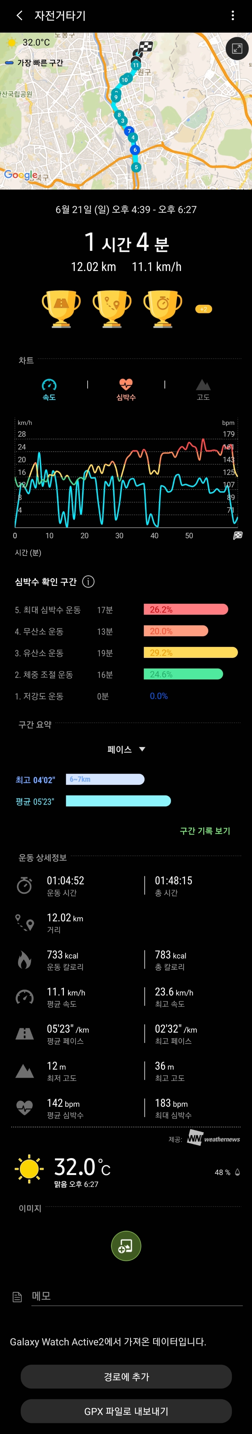 위 캡쳐화면은 갤럭시워치 액티브2로 자전거타기 트랙킹이 돼서 가져온 것이다.