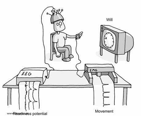 리벳은 피험자들에게 "시계를 보다가 손가락을 움직이기로 마음먹을 때 움직여라"고 부탁하고, 뇌파검사(EEG)를 통해 뇌가 결정을 내리는 순간을 측정했다.