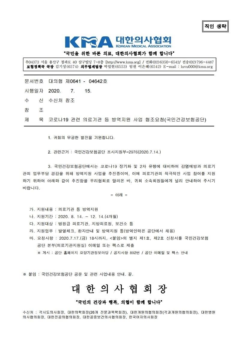 7월 15일 국민건강보험공단에서는 코로나19 장기화 및 2차 유행에 대비하여 감염예방과 의료기관의 업무부담 경감을 위해 방역지원 사업을 추진하겠다고 밝혔다. 현재까지는 의사를 비롯한 보건의료인력과 개별 의료기관들의 희생과 헌신으로 코로나19 사태를 버텨왔지만, 이제는 일상이 될 감염병 사태를 대비해야 하기에, 지금이라도 정부가 코로나19 방역관련 인력 지원을 결정한 것에 환영하는 바이다.