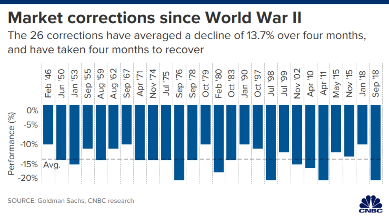 역사 상 2차 세계 대전 이후로 20% 이상 증시가 빠지지는 않은 조정이 26번 있었는데, 평균 4개월 간 13.7%의 하락이 있었으며, 회복하는데 4개월이 걸렸다고 한다.